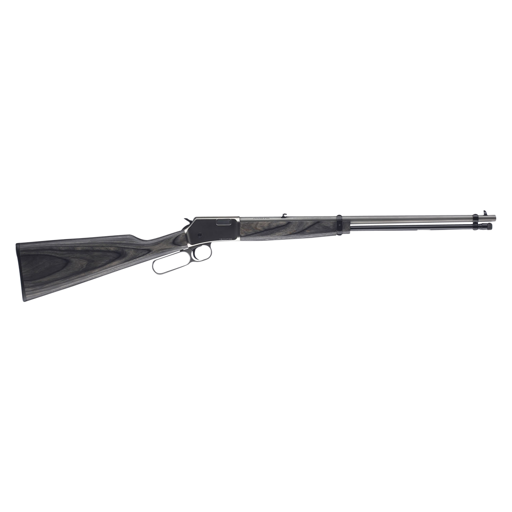 The BL-22 satin nickel receiver with a stainless barrel. Satin finished gray laminated stock, short-throw lever action, receiver grooved for scope mounts, and adjustable folding rear leaf sight.