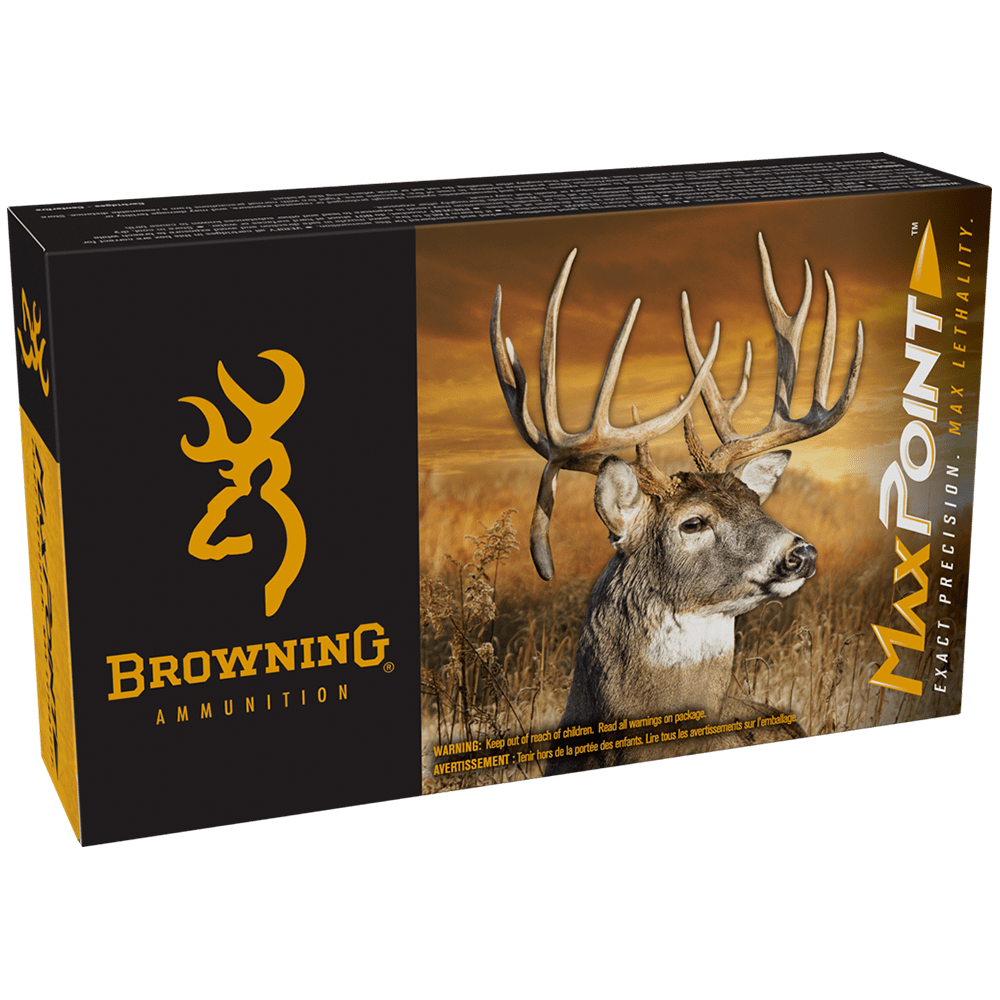 Browning® Max Point Rifle ammunition is designed specifically for hunting medium-sized game, including whitetail deer, mule deer, and pronghorn. Max Point bullets are meticulously manufactured, designed to quickly transfer expansion energy for maximum lethality to game, and to ensure critical shot placement is made with exact precision.