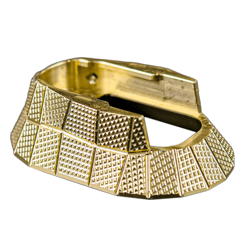 This magwell is CNC machined from solid 6061 Aluminum, anodized in brass, and features the aggressive GridLOK texture for increased grip.
