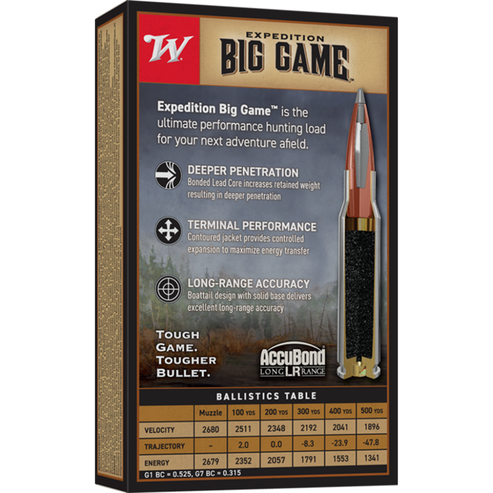 Flat shooting with pinpoint accuracy, Winchester Expedition Big Game Long Range uses the tough, deep penetrating Accubond Long Range bullet for supreme performance on the biggest game even at longer distances. Controlled expansion allows for penetrating thick hide and bone before delivering massive knock-down power. Expedition Big Game Long Range is an ultimate performance hunting load for wherever your dream hunt takes you.