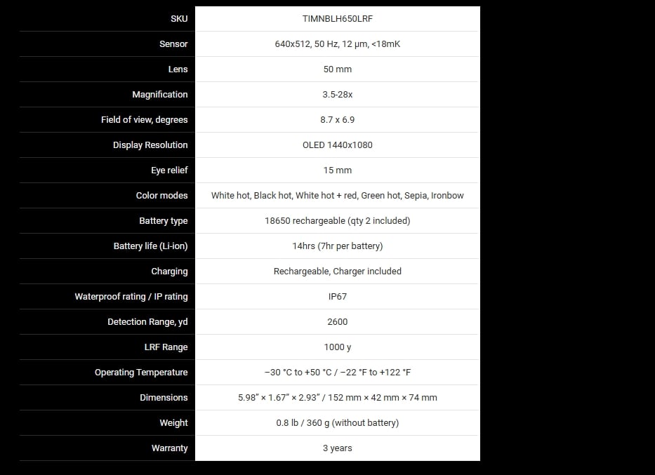 The ATN BlazeHunter 650 LRF is the flagship of the BlazeHunter LRF series — combining the 640×512 vanadium oxide uncooled focal plane sensor with the highest magnification in the range at 3.5–28x, and detection out to an impressive 2,600 yards. For hunters and property managers who need to identify targets at serious distances without compromising on portability, this is the one to reach for.