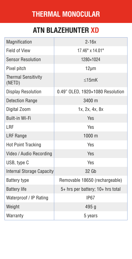 The ATN BlazeHunter XD LRF is ATN's most powerful thermal monocular — built around a sixth-generation 1280×1024 sensor that delivers over a million more pixels than standard thermal devices. With a ≤15 mK NETD rating and detection range to 3,400 metres, it captures finer detail and faint temperature differences that other thermal devices simply miss. This is extreme definition thermal imaging in a handheld package.