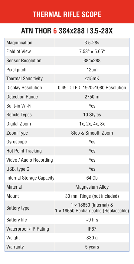 Recoil Activated Video records automatically around every trigger pull, built-in Wi-Fi streams live to the ATN Connect 6 app, and 64 GB of onboard storage captures everything directly to the scope. Two replaceable 18650 cells deliver around 9 hours of runtime in a package weighing under 2.2 lbs.