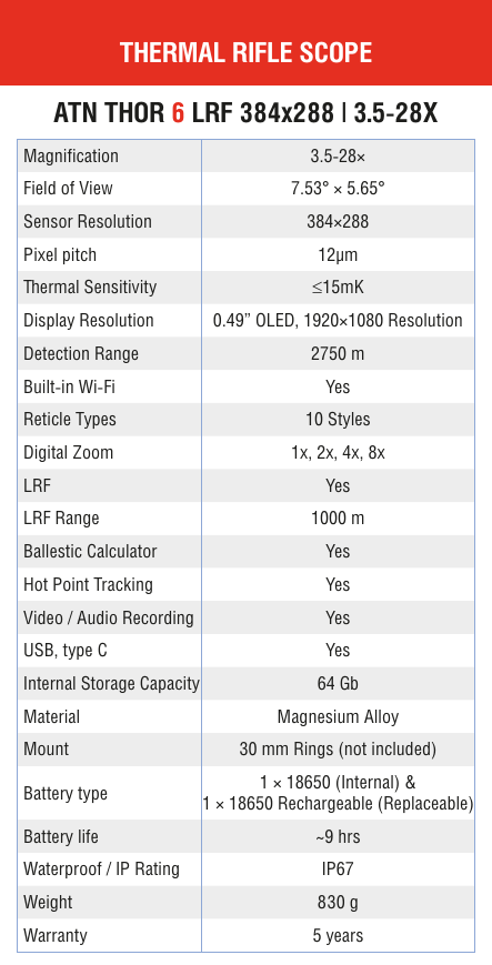 The ATN ThOR 6 LRF 384x288 takes everything that makes the ThOR 6 an elite thermal scope and adds a built-in Laser Rangefinder and multi-profile Ballistic Calculator - putting complete, shot-ready information directly in your field of view. The integrated LRF delivers instant, accurate distance-to-target data without extra gear or manual calculation, and the ballistic calculator automatically adjusts your reticle for range and angle. Store up to six custom profiles and swap between platforms without re-zeroing.