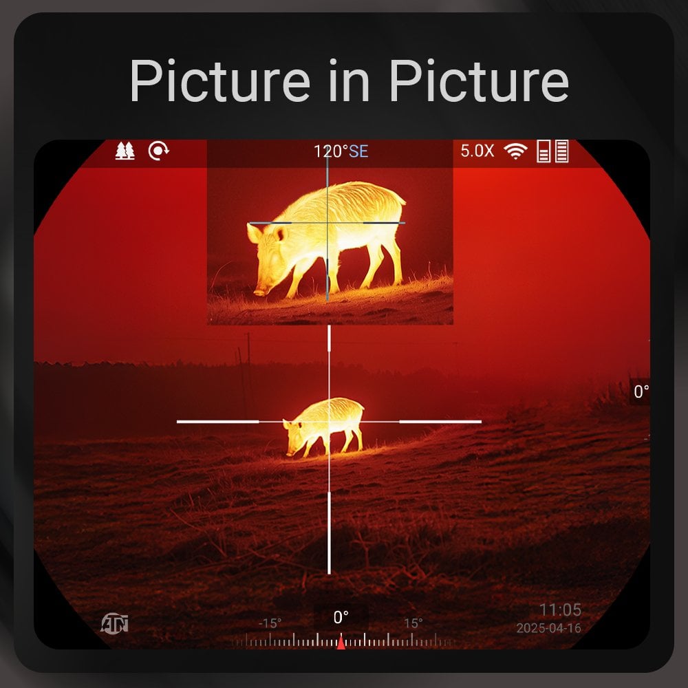 SharpIR AI image enhancement sharpens thermal imagery in real time, while the 0.49-inch 1920×1080 OLED display, six colour palettes, Picture-in-Picture zoom, Hot Point Tracking, adjustable reticle transparency, and Zeroing Freeze give you complete control in any environment. Recoil Activated Video records every shot automatically, built-in Wi-Fi streams live to the ATN Connect 6 app, and 64 GB of internal storage keeps everything saved on-device.