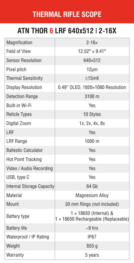 The ATN ThOR 6 LRF 640x512 combines the highest thermal resolution in the ThOR 6 range with a built-in Laser Rangefinder and multi-profile Ballistic Calculator, making it the most capable all-in-one thermal scope in the series. The 640×512 sensor with ≤15 mK NETD detects heat signatures to 3,100 metres, and the integrated LRF delivers instant distance-to-target data that feeds directly into the ballistic calculator - automatically adjusting your reticle for range and angle with no manual input required. Store up to six custom profiles and switch platforms without re-zeroing.