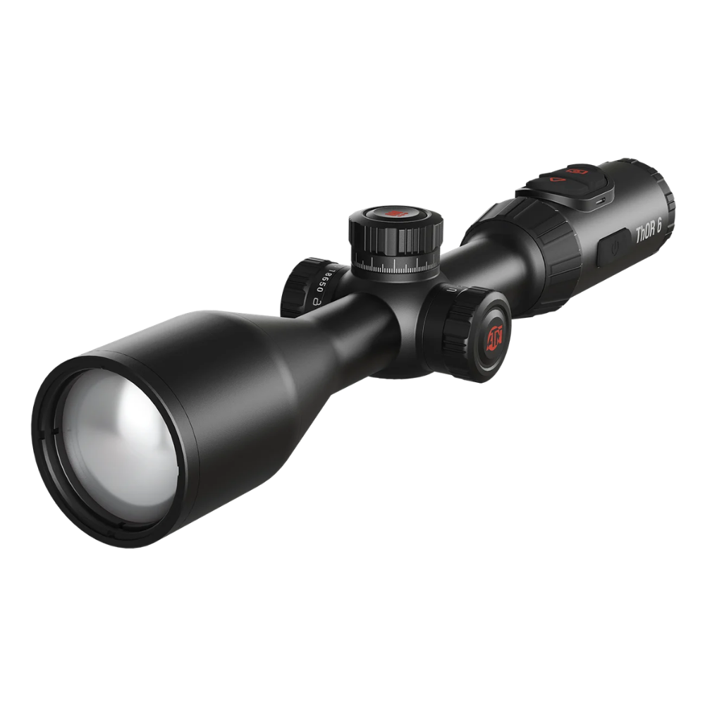 All the precision features of the ThOR 6 platform are present: 0.49-inch 1920×1080 OLED display, six colour palettes, Picture-in-Picture zoom, Hot Point Tracking, adjustable reticle transparency, and Zeroing Freeze. Recoil Activated Video captures every shot automatically, 64 GB of internal storage records footage on-device, and built-in Wi-Fi connects to the ATN Connect 6 app for live viewing and instant sharing.