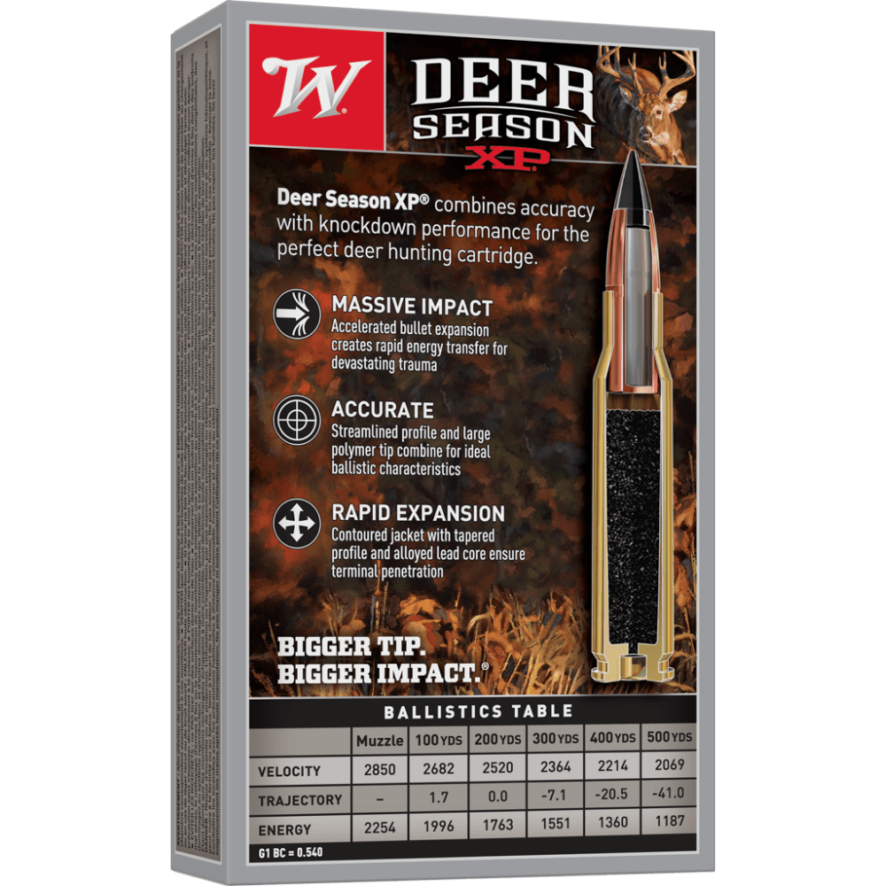 Deer Season XP ammunition combines our extensive experience into a product engineered specifically for deer hunters. The Extreme Point bullet features an oversized impact diameter. A bigger impact diameter means more impact trauma, better energy transfer, and larger wound cavities for faster knockdown.